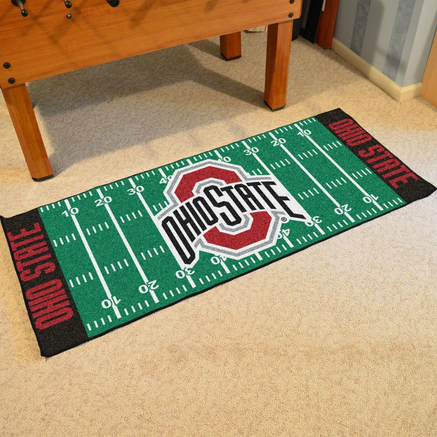 The Ohio State Buckeyes Football Field Runner Rug adds a sports feel to any bar or game room. With its football field design, official team logos and colors, and quality construction, this rug +will be a fan favorite. Using a Chromojet printing process, the team colors are injected into the rug for a precise finish. The vinyl backing keeps the carpet in place and surged edges prevent fraying.