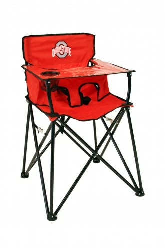 Parents will be a huge fan of the Ohio State Buckeyes High Chair! Decorated with an official collegiate logo, this chair’s ability to fold up makes it great for on the go use. +The clear vinyl tray cover makes clean up easy, and a built-in cupholder gives your child a better chance of keeping their bottle on the tray (hopefully). Safety locks prevent the chair from closing, while the lap belt securely holds your child in place. Bring it to the tailgate, picnic, or vacation and show your team pride!