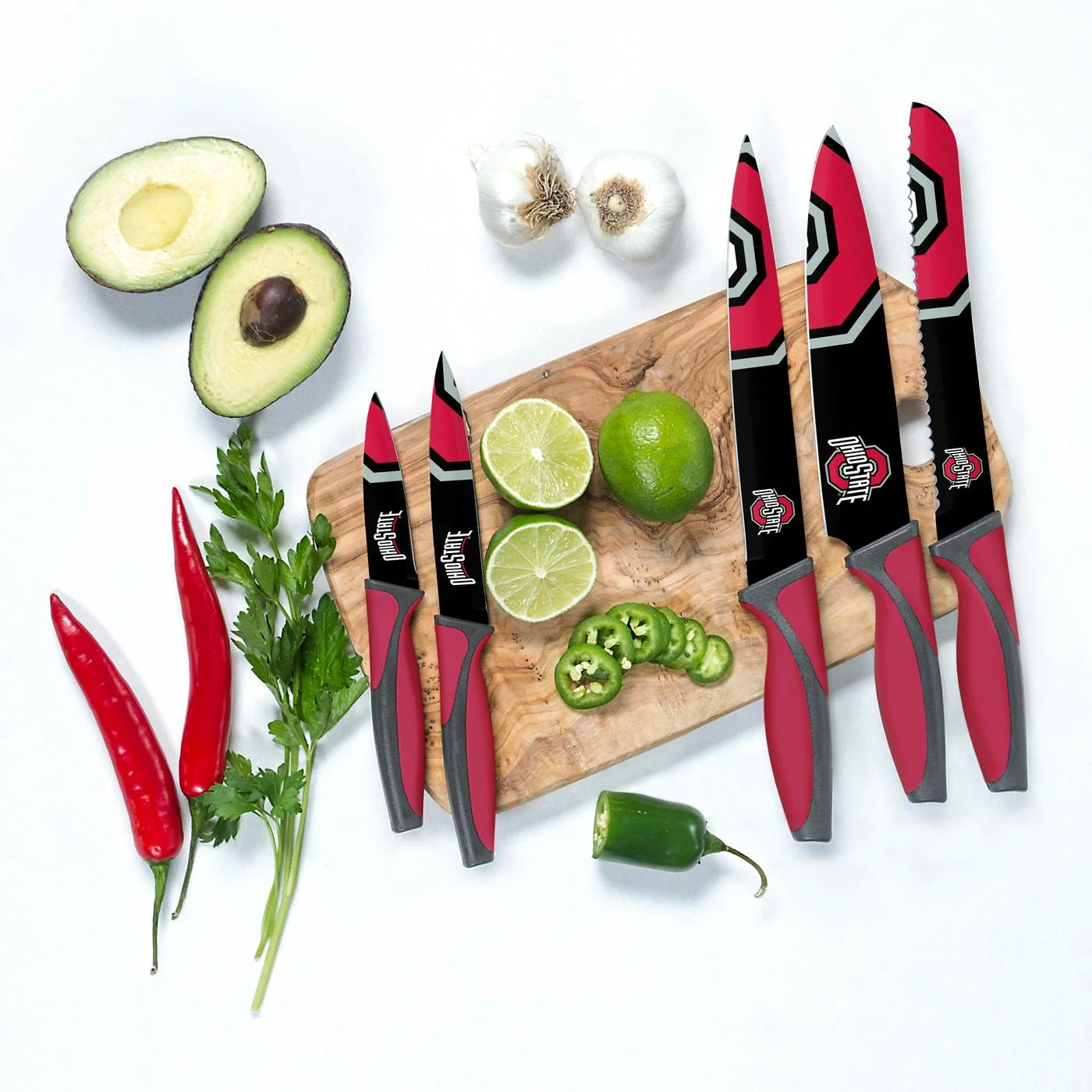 Printed in full team colors, the beautiful Ohio State Buckeyes Kitchen Knives are perfect for game day at the house or tailgate! Whatever you’re preparing for the big game, this set includes every +knife you’ll need to prepare a feast. It’s time to step up your chef skills in the kitchen with this sleek stainless steel knife set!