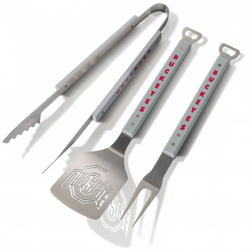 Essential for the tailgater and backyard griller, the Ohio State Buckeyes Spirit Series 3-Piece BBQ Set shows off your team pride, while getting the job done on the grill. Included with the set +is a spatula with laser-cut team logo, tongs, and a fork. Each piece is stamped with the team name, and the spatula and fork have a built-in bottle opener. Made of heavy-duty stainless steel, this set is built to last!